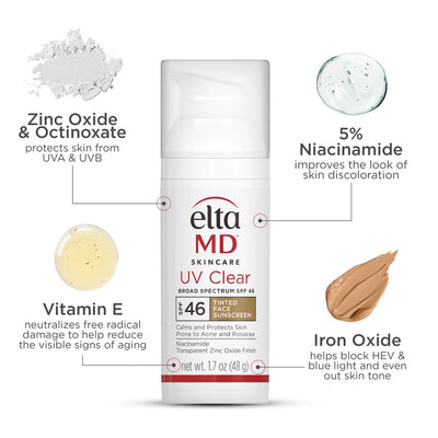 EltaMD UV Clear Broad Spectrum SPF 46 is a lightweight, sheer-tinted sunscreen designed to protect and even out skin tone while calming sensitive and acne-prone skin. Formulated with 5% Niacinamide (Vitamin B3), this broad spectrum sunscreen helps reduce the appearance of blemishes and discoloration for smoother, clearer skin.