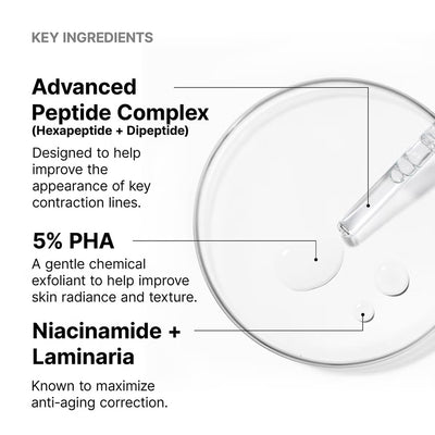 A peptide-powered, wrinkle-correcting serum designed to deliver smooth, radiant, youthful-looking skin without injections. Inspired by the effects of anti-wrinkle neurotoxin treatments, this advanced formula targets 9 types of expression lines while enhancing skin texture and luminosity. Clinically shown to improve visible wrinkles and reveal glass-like radiance in just one week.
